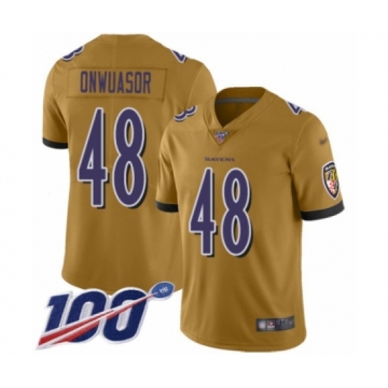 >Men's Baltimore Ravens #48 Patrick Onwuasor Limited Gold Inverted Legend 100th Season Football Jersey