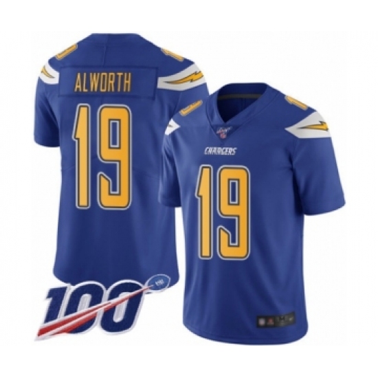 >Men's Los Angeles Chargers #19 Lance Alworth Limited Electric Blue Rush Vapor Untouchable 100th Season Football Jersey