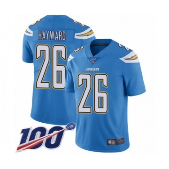 >Men's Los Angeles Chargers #26 Casey Hayward Electric Blue Alternate Vapor Untouchable Limited Player 100th Season Football Jersey