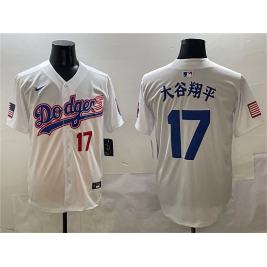 >Men's Los Angeles Dodgers #17 大谷翔平 White With American Flag Limited Stitched Baseball Jersey