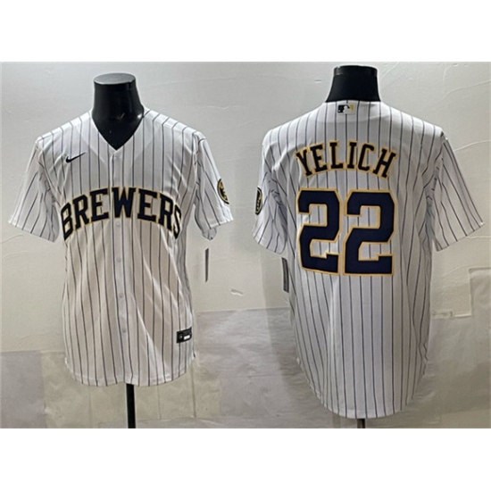>Men's Milwaukee Brewers #22 Christian Yelich White Pinstripe 2025 With Stitched Jersey