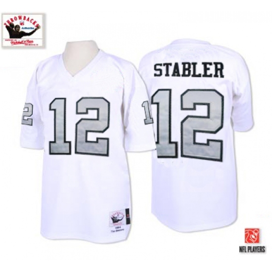 Feel like part of your favorite team by wearing this NFL® Mitchell and Ness Oakland Raiders #12 Kenny Stabler White with Silver No. Authentic NFL Throwback Jersey, made of thick, high-quality Pro-Brite fabric for a genuine gridiron look. The players number which 100% stitched is displayed in tackle twill on the chest, back and sleeves, along with the team name on the front. The players name which 100% stitched is displayed on a sewn-down nameplate at the back. 100% Pro-Brite nylon and 100% Pro-Brite polyester for body, 100% lycratalic spandex dazzle for Side Panels/Collar/Cuffs, NFL® Equipment patch sewn on the bottom of the front collar or fabric insert, NFL® Equipment jock tag with numeric sizing is applied to the lower left bottom of the jersey, Officially licensed