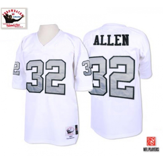 Feel like part of your favorite team by wearing this NFL® Mitchell and Ness Oakland Raiders #32 Marcus Allen White with Silver No. Authentic NFL Throwback Jersey, made of thick, high-quality Pro-Brite fabric for a genuine gridiron look. The players number which 100% stitched is displayed in tackle twill on the chest, back and sleeves, along with the team name on the front. The players name which 100% stitched is displayed on a sewn-down nameplate at the back. 100% Pro-Brite nylon and 100% Pro-Brite polyester for body, 100% lycratalic spandex dazzle for Side Panels/Collar/Cuffs, NFL® Equipment patch sewn on the bottom of the front collar or fabric insert, NFL® Equipment jock tag with numeric sizing is applied to the lower left bottom of the jersey, Officially licensed