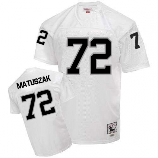 Feel like part of your favorite team by wearing this NFL® Mitchell and Ness Oakland Raiders #72 John Matuszak White Authentic NFL Throwback Jersey, made of thick, high-quality Pro-Brite fabric for a genuine gridiron look. The players number which 100% stitched is displayed in tackle twill on the chest, back and sleeves, along with the team name on the front. The players name which 100% stitched is displayed on a sewn-down nameplate at the back. 100% Pro-Brite nylon and 100% Pro-Brite polyester for body, 100% lycratalic spandex dazzle for Side Panels/Collar/Cuffs, NFL® Equipment patch sewn on the bottom of the front collar or fabric insert, NFL® Equipment jock tag with numeric sizing is applied to the lower left bottom of the jersey, Officially licensed