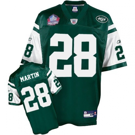 Feel like part of your favorite team by wearing this NFL® Reebok New York Jets #28 Curtis Martin Green Team Color Hall of Fame 2012 Authentic Throwback NFL Jersey, made of thick, high-quality Pro-Brite fabric for a genuine gridiron look. The players number which 100% stitched is displayed in tackle twill on the chest, back and sleeves, along with the team name on the front. The players name which 100% stitched is displayed on a sewn-down nameplate at the back. 100% Pro-Brite nylon and 100% Pro-Brite polyester for body, 100% lycratalic spandex dazzle for Side Panels/Collar/Cuffs, NFL® Equipment patch sewn on the bottom of the front collar or fabric insert, NFL® Equipment jock tag with numeric sizing is applied to the lower left bottom of the jersey, Reebok® logo embroidered on each sleeve, Officially licensed.