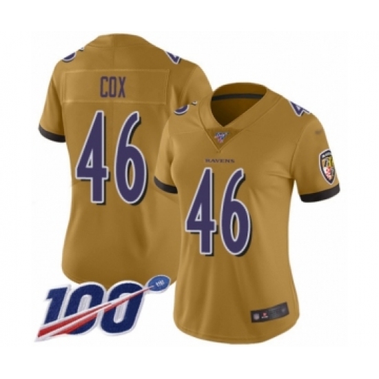 >Women's Baltimore Ravens #46 Morgan Cox Limited Gold Inverted Legend 100th Season Football Jersey