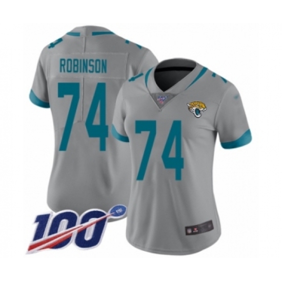 >Women's Jacksonville Jaguars #74 Cam Robinson Silver Inverted Legend Limited 100th Season Football Jersey