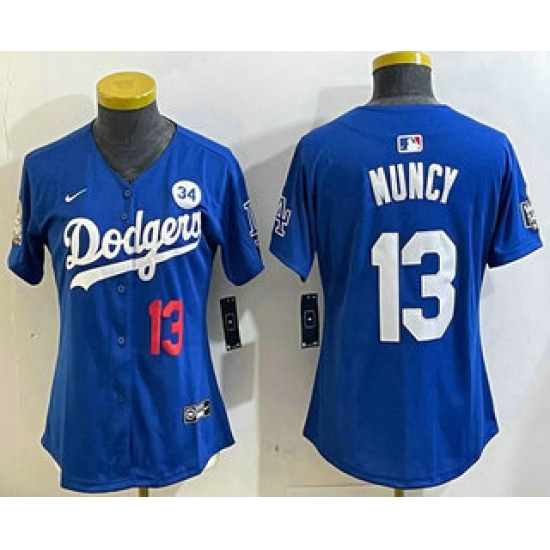 >Women's Los Angeles Dodgers #13 Max Muncy Number Blue 2024 World Series With Fernando 34 Fashion Limited Stitched Jersey