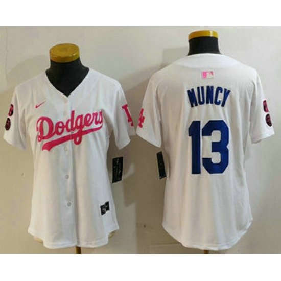 >Women's Los Angeles Dodgers #13 Max Muncy White Pink With Limited Stitched Jersey