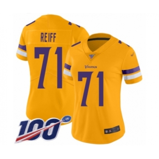 >Women's Minnesota Vikings #71 Riley Reiff Limited Gold Inverted Legend 100th Season Football Jersey