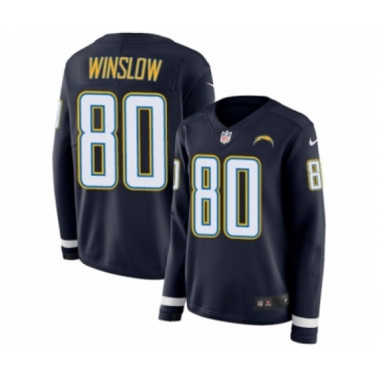 >Women's Nike Los Angeles Chargers #80 Kellen Winslow Limited Navy Blue Therma Long Sleeve NFL Jersey