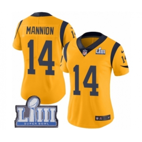 >Women's Nike Los Angeles Rams #14 Sean Mannion Limited Gold Rush Vapor Untouchable Super Bowl LIII Bound NFL Jersey