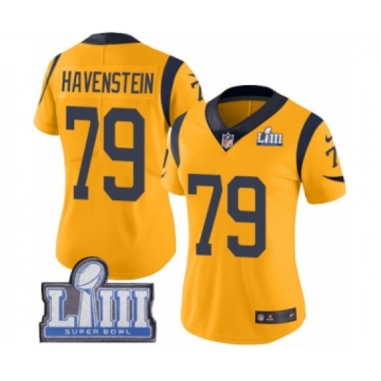 >Women's Nike Los Angeles Rams #79 Rob Havenstein Limited Gold Rush Vapor Untouchable Super Bowl LIII Bound NFL Jersey