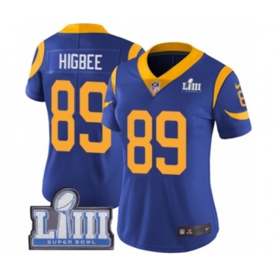 >Women's Nike Los Angeles Rams #89 Tyler Higbee Royal Blue Alternate Vapor Untouchable Limited Player Super Bowl LIII Bound NFL Jersey