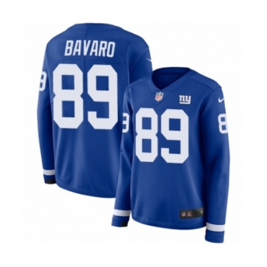 >Women's Nike New York Giants #89 Mark Bavaro Limited Royal Blue Therma Long Sleeve NFL Jersey