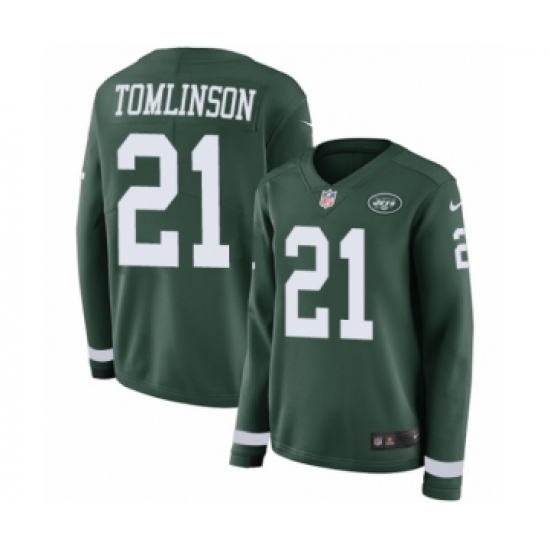 >Women's Nike New York Jets #21 LaDainian Tomlinson Limited Green Therma Long Sleeve NFL Jersey