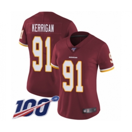 >Women's Washington Redskins #91 Ryan Kerrigan Burgundy Red Team Color Vapor Untouchable Limited Player 100th Season Football Jersey