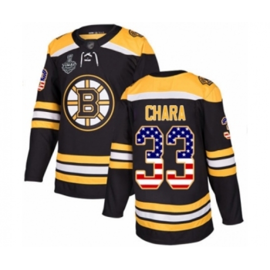>Men's Boston Bruins #33 Zdeno Chara Authentic Black USA Flag Fashion 2019 Stanley Cup Final Bound Hockey Jersey
