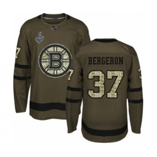>Men's Boston Bruins #37 Patrice Bergeron Authentic Green Salute to Service 2019 Stanley Cup Final Bound Hockey Jersey