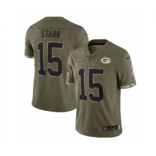 >Men's Green Bay Packers #15 Bart Starr 2022 Olive Salute To Service Limited Stitched Jersey