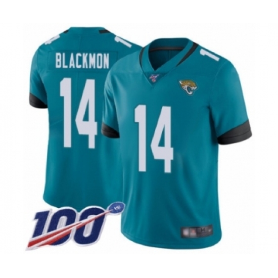 >Men's Jacksonville Jaguars #14 Justin Blackmon Teal Green Alternate Vapor Untouchable Limited Player 100th Season Football Jersey