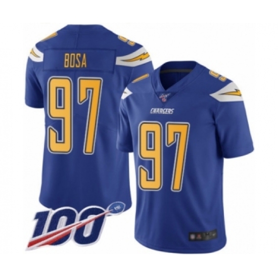 >Men's Nike Los Angeles Chargers #97 Joey Bosa Limited Electric Blue Rush Vapor Untouchable 100th Season NFL Jersey