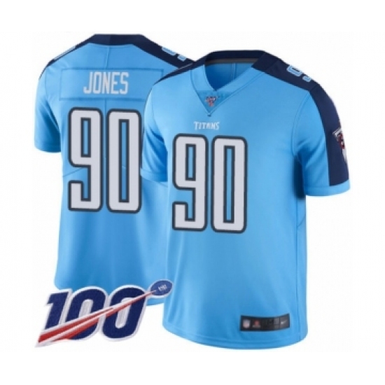 >Men's Tennessee Titans #90 DaQuan Jones Limited Light Blue Rush Vapor Untouchable 100th Season Football Jersey