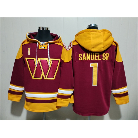 >Men's Washington Commanders #1 Deebo Samuel Sr. Burgundy Ageless Must-Have Lace-Up Pullover Hoodie