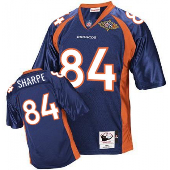 Feel like part of your favorite team by wearing this NFL® Mitchell And Ness Denver Broncos #84 Shannon Sharpe Navy Blue Super Bowl Authentic Throwback NFL Jersey, made of thick, high-quality Pro-Brite fabric for a genuine gridiron look. The players number which 100% stitched is displayed in tackle twill on the chest, back and sleeves, along with the team name on the front. The players name which 100% stitched is displayed on a sewn-down nameplate at the back. 100% Pro-Brite nylon and 100% Pro-Brite polyester for body, 100% lycratalic spandex dazzle for Side Panels/Collar/Cuffs, NFL® Equipment patch sewn on the bottom of the front collar or fabric insert, NFL® Equipment jock tag with numeric sizing is applied to the lower left bottom of the jersey, Reebok® logo embroidered on each sleeve, Officially licensed.