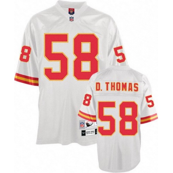 Feel like part of your favorite team by wearing this NFL® Mitchell and Ness Kansas City Chiefs #58 Derrick Thomas White Authentic Throwback NFL Jersey, made of thick, high-quality Pro-Brite fabric for a genuine gridiron look. The players number which 100% stitched is displayed in tackle twill on the chest, back and sleeves, along with the team name on the front. The players name which 100% stitched is displayed on a sewn-down nameplate at the back. 100% Pro-Brite nylon and 100% Pro-Brite polyester for body, 100% lycratalic spandex dazzle for Side Panels/Collar/Cuffs, NFL® Equipment patch sewn on the bottom of the front collar or fabric insert, NFL® Equipment jock tag with numeric sizing is applied to the lower left bottom of the jersey, Officially licensed.