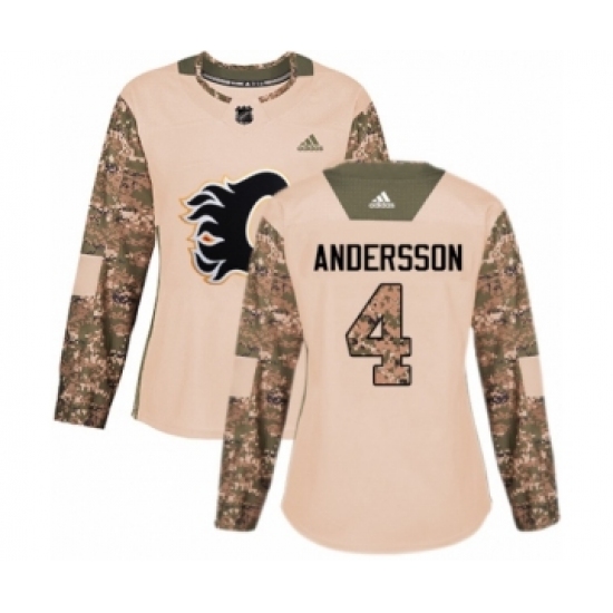 >Women's Adidas Calgary Flames #4 Rasmus Andersson Authentic Camo Veterans Day Practice NHL Jersey