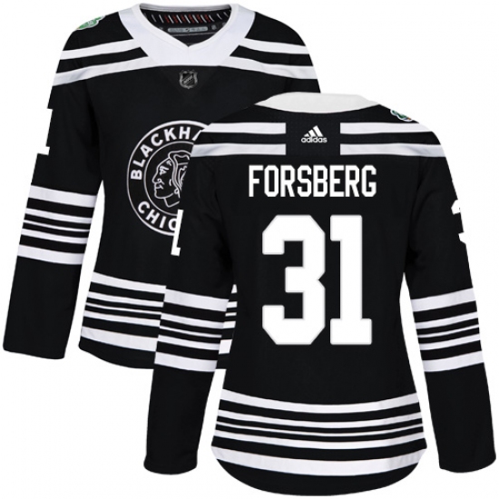 >Women's Adidas Chicago Blackhawks #31 Anton Forsberg Authentic Black 2019 Winter Classic NHL Jersey
