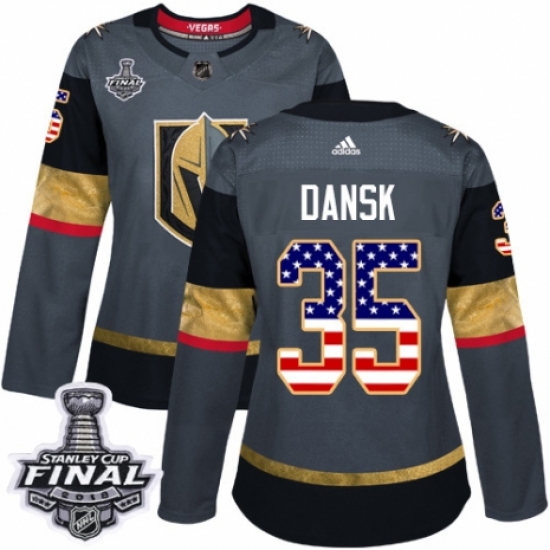 >Women's Adidas Vegas Golden Knights #35 Oscar Dansk Authentic Gray USA Flag Fashion 2018 Stanley Cup Final NHL Jersey