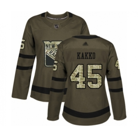 >Women's New York Rangers #45 Kaapo Kakko Authentic Green Salute to Service Hockey Jersey