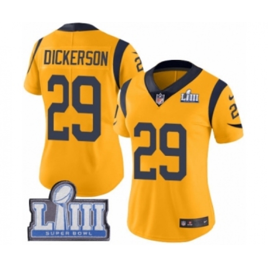 >Women's Nike Los Angeles Rams #29 Eric Dickerson Limited Gold Rush Vapor Untouchable Super Bowl LIII Bound NFL Jersey
