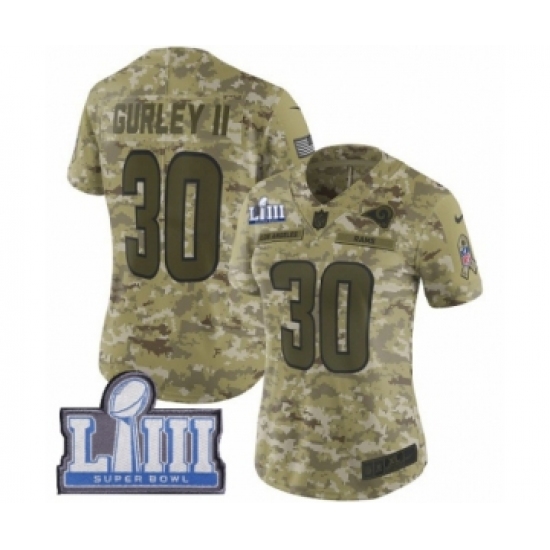 >Women's Nike Los Angeles Rams #30 Todd Gurley Limited Camo 2018 Salute to Service Super Bowl LIII Bound NFL Jersey
