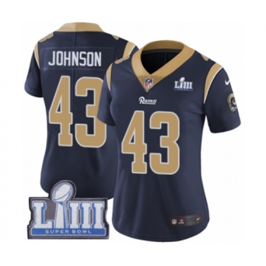 >Women's Nike Los Angeles Rams #43 John Johnson Navy Blue Team Color Vapor Untouchable Limited Player Super Bowl LIII Bound NFL Jersey
