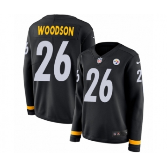 >Women's Nike Pittsburgh Steelers #26 Rod Woodson Limited Black Therma Long Sleeve NFL Jersey