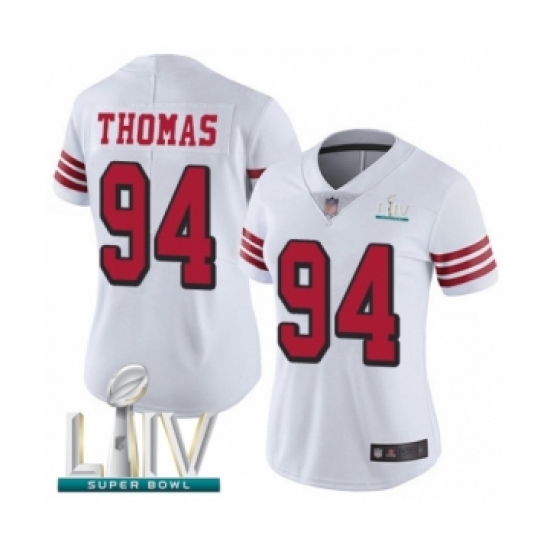 >Women's San Francisco 49ers #94 Solomon Thomas Limited White Rush Vapor Untouchable Super Bowl LIV Bound Football Jersey