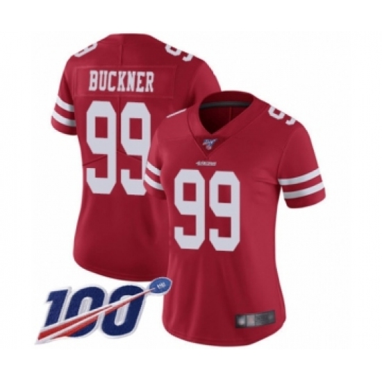 >Women's San Francisco 49ers #99 DeForest Buckner Red Team Color Vapor Untouchable Limited Player 100th Season Football Jersey