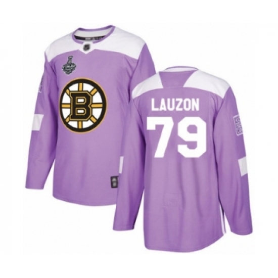 >Youth Boston Bruins #79 Jeremy Lauzon Authentic Purple Fights Cancer Practice 2019 Stanley Cup Final Bound Hockey Jersey