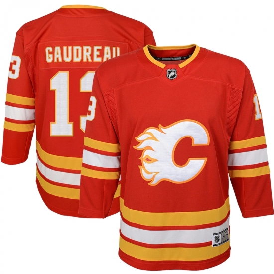 >Youth Calgary Flames #13 Johnny Gaudreau Red 2020-21 Home Premier Player Jersey