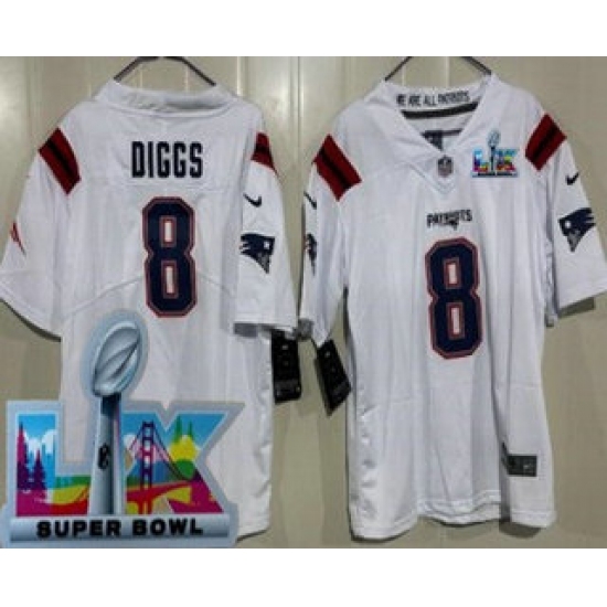 >Youth New England Patriots #8 Stefon Diggs Limited White Super Bowl LX Vapor Jersey